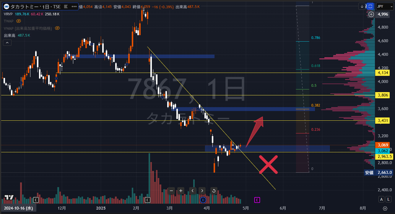 玩具の大手、バンダイナムコと双璧。玩具(男児・女児・乳幼児向け玩具、ファッション玩具、アクション玩具、カードゲーム)、玩具周辺(カプセル玩具、玩具菓子、TVアニメ)、アミューズメント機器の制作・販売。前回決算では期待感が剥落したことで大幅下落となるも、3000円ラインを意識した踊り場を形成。今期は主力ブランドの強化や海外展開の拡大により、業績が引き続き成長すると見込まれているが、円高進行は重荷で要注意。足形的には本決算までの期待上げによるトレンドの転換狙いで、3400~3600円を目標値にしたい。個人が好む銘柄でお世辞にも需給が良いとは言えず、下落トレンド継続となった場合は撤退を視野に。