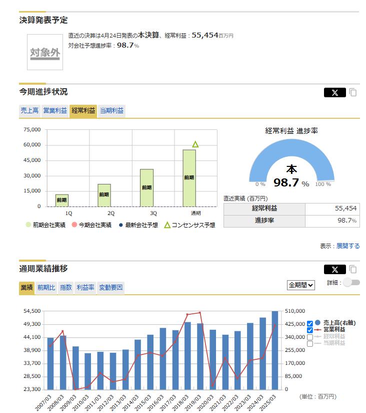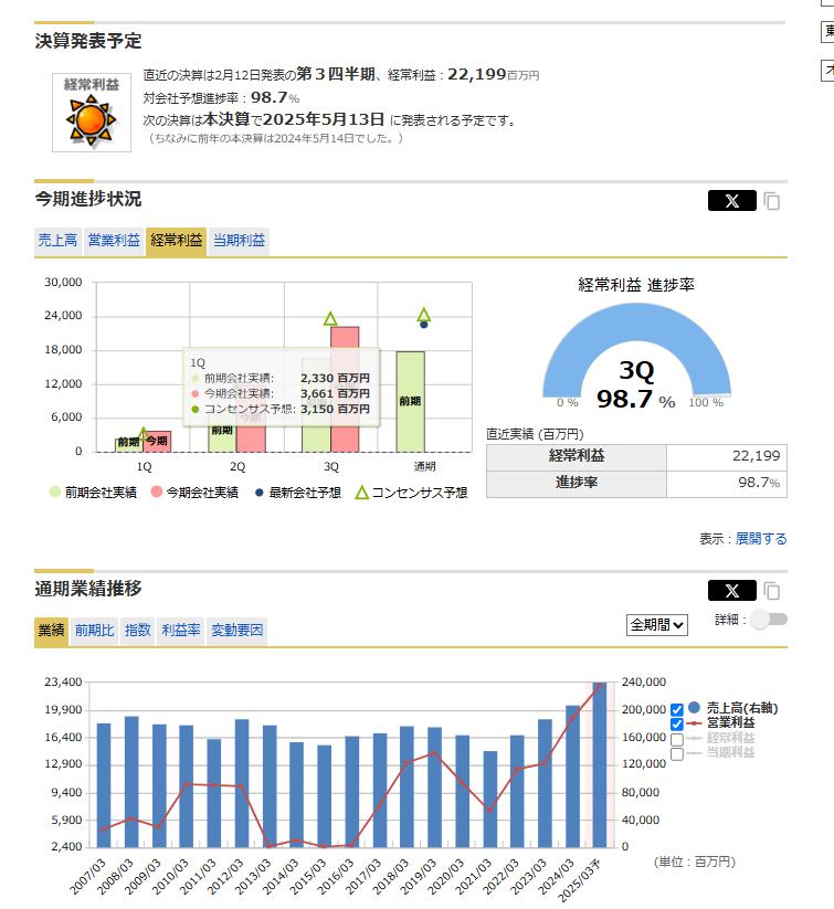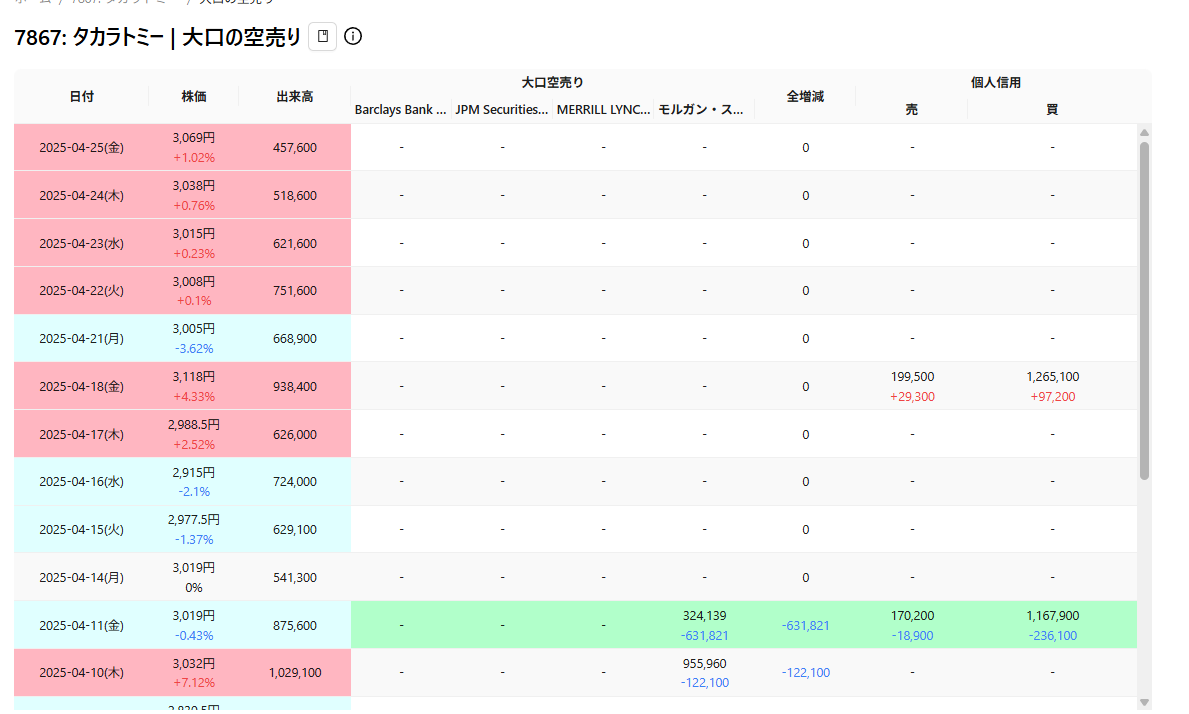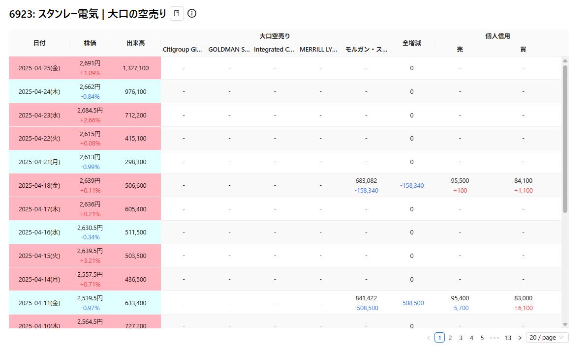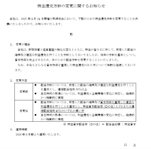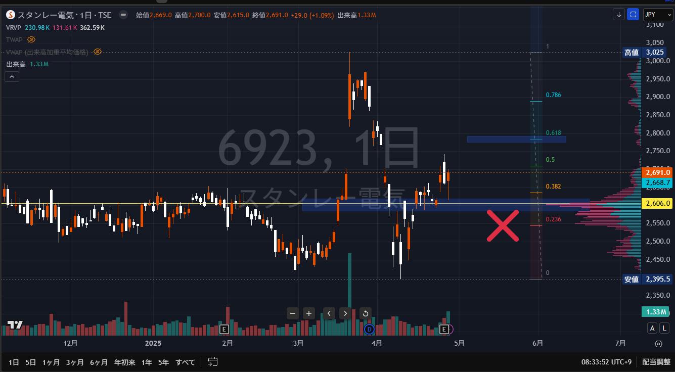 光デバイスメーカー。自動車機器(自動車用ランプ、二輪車用ランプ)、コンポーネンツ(電子デバイス製品、LED、液晶)、電子応用製品(液晶用バックライト、操作パネル、LED照明、深紫外線製品)の製造販売。前期は中国やアジアの不振が厳しかったが、合理化施策で影響は低い。関税影響で今期の業績非開示とするも「株主還元方針の変更に関するお知らせ 」にあるように、株主資本配当率(DOE)3.5%または連結配当性向40%のいずれか高い方と変更した点は今後株価にポジティブ。需給面を見ると常時出来高に対してはるかに少ない信用買い残、かつ「モルガン」の空売り買い戻し動向は好感を持てる。金曜日に2600円ラインを下ヒゲで戻しており、ファンダメンタルズよりも需給・足形からエントリーがしやすいためチョイス。
