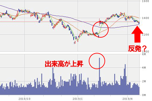 上記チャートの印の部分はローソク足が窓を空けており、上昇していることがわかりますね。大きな出来高も伴っています。