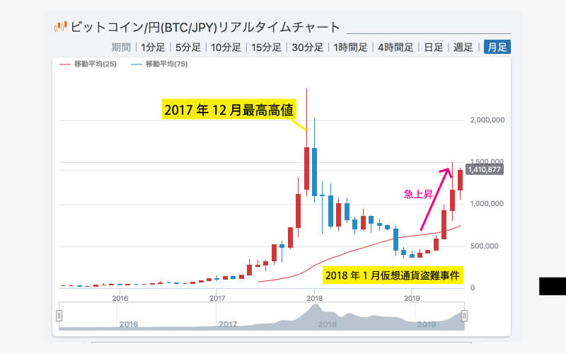 2009年世界で発売開始と同時に、それまでは緩やかな上昇を続けていたビットコインですが、 この200万円突破をキッカケに相場は大きく動きます 。
