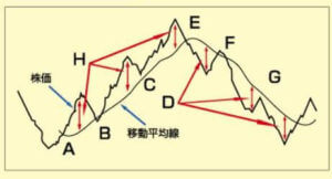 H:上昇中の移動平均線から株価が大きく上に離れすぎた場合、株価は高値警戒感から自律反発する可能性が高い