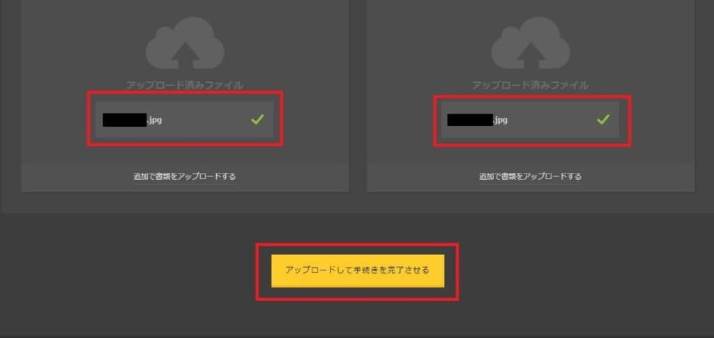 アップロードが終了すると、ファイル名の横に緑のチェックマークがついています。これが写真付本人確認と郵送物等の両方についている事を確認して、「アップロードして手続きを完了させる」のボタンをクリックします。