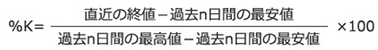 一方で分子は取引当日の終値とn日間の最安値との差です。したがって%Kは、その日の終値が過去n日間の値幅の中でどこに位置しているかを把握するのに役立ちます。