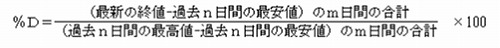 分子は%Kの分子をm日間分合計したもの、分母も%Kの分母をm日間合計したものを%で表します。