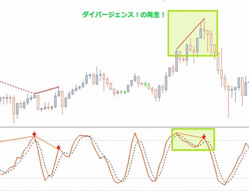 この図では上昇トレンドが発生しているのにストキャスティクスは切り下がっている 『ダイバージェンス』が発生 しています。