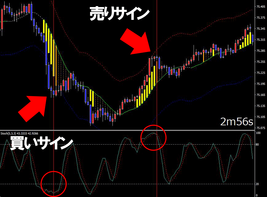 特徴としては主にボックス相場(レンジ相場)にて『%Kと%Dという2本の線を用いて明確に売買シグナルが出る』ということです。
