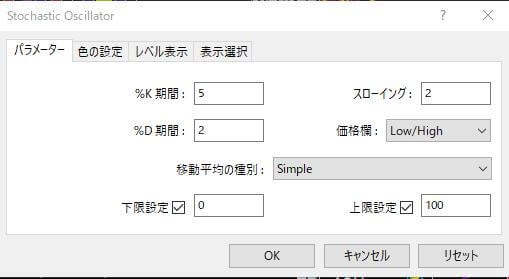 下の図のようなデフォルト設定をそのまま利用し、基本的にはクロスした時がサインとなり、%Kが上か下のどちらに抜くかでサインを判断しましょう。