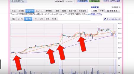 25日移動平均線に株価がタッチしているところが4か所あります。(赤矢印部分)